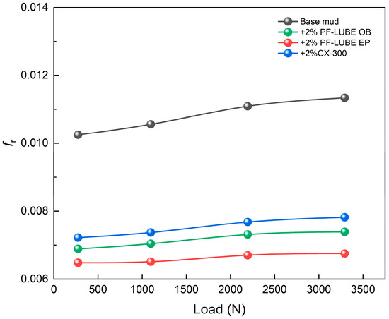 During the experiment, the system was first operated under a constant load for 5 min to ensure stable performance. The load was then incrementally increased, and testing continued for an additional 5 min. Friction coefficients under different loading conditions were calculated and are presented in Figure 8.