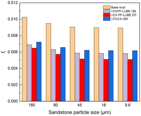 In the laboratory, artificial sandstones with varying particle sizes were used to simulate the effects of different geological formations on the friction coefficient. The particle sizes ranged from 180 μm to 9.6 μm, representing a spectrum from coarse sandstone to siltstone formations. The corresponding friction coefficients are presented in Figure 9. Experimental results demonstrate that rock type significantly influences lubricant performance. When simulating drilling through formations with particle sizes decreasing from 180 μm (coarse sandstone) to 9.6 μm (siltstone), the friction coefficient associated with PF-LUBE EP decreased from 0.006478 to 0.005092—a 21.4% reduction. This decline is attributed to the smoother contact interfaces and lower permeability of fine-grained formations, which facilitate the formation of a stable, continuous oil film and thus reduce friction more effectively.