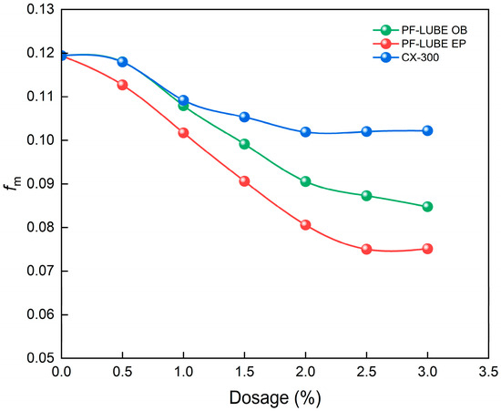 For CX-300, the minimum friction coefficient was observed at 1.5 wt%, indicating that surface adsorption reaches saturation at this dosage. Additional increases in lubricant concentration did not significantly enhance performance, suggesting diminishing returns beyond the saturation threshold.