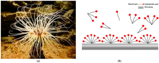 Bionic sea anemone lubrication mechanism of PF-LUBE EP. Bionic sea anemone lubrication mechanism of PF-LUBE EP: (a) sea anemone adsorption, and (b) bionic mechanism.