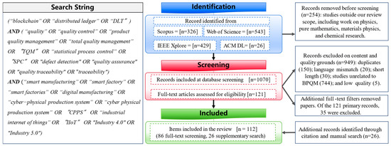 Furthermore, after the core database search and screening yielded 86 eligible studies, we performed a supplementary search to reduce retrieval bias and ensure thematic saturation, following PRISMA recommendations for citation searching and manual searching. First, we conducted backward and forward citation tracking in our four primary databases and Google Scholar for each of the 86 papers (i.e., screening their reference lists and all records that cited them). Second, we hand-searched the table of contents of three leading journals (IEEE Transactions on Industrial Informatics, Journal of Manufacturing Systems, and Computers & Industrial Engineering) and the proceedings of two flagship conferences (IEEE IEM, and ACM/IEEE ICCPS). All records discovered in these two steps were de-duplicated against the core set and screened with the same inclusion/exclusion criteria. A total of 26 papers met every criterion and were therefore added to the review, bringing the final corpus to 112 studies. These additional papers close gaps in the initial set by addressing key enabling topics, such as product data management, vision-based quality inspection, and smart contract optimization, which are essential for a comprehensive understanding of BPQM in smart manufacturing contexts.