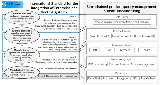 As shown in Figure 2, at the production perception and control level (Level 1), raw manufacturing data is captured from sensors and serves as input for blockchain storage. At the production monitoring and control level (Level 2), raw data from the Data Acquisition and Monitoring Control System is broadcast and verified through the blockchain network layer. At the manufacturing operations management level (Level 3), a smart contract-based execution script automates and autonomously manages workflows. At the business planning and logistics level (Level 4), decentralized applications handle error tracing, fault location, and PQM in the distributed manufacturing context.