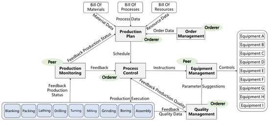 System implementation at the intra-enterprise level is more highly coordinated and integrated than at the inter-enterprise level, focusing on the coordination of production control between enterprises. As shown in Figure 4, to coordinate and optimize the overall production process at the intra-enterprise level, the system implementation should begin with the production planning system. A BPQM system can coordinate order data, material data, and part of capacity across the supply chain, optimizing both efficiency and cost structure [29]. Knowledge within the enterprise can be learned based on reliable, high-quality data guaranteed by the blockchain, and the learned knowledge can be further used to predict and adjust real-time production instructions. Afterward, program control management and equipment management can be considered in the system implementation.