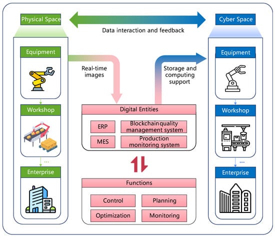 Cyber–physical twinning forms the foundation for configuring and operating cyber–physical systems in PQM. As shown in Figure 5, the cyber–physical system for PQM integrates physical space and cyberspace across multiple levels (e.g., equipment, workshop, enterprise). The effective and secure use of cyber–physical twinning data enhances the value of data utilization and compensates for deficiencies in intelligent manufacturing within both physical and cyber spaces.