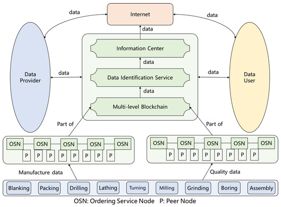 Blockchain is highly transparent, decentralized, trustless, and collectively maintained. Blockchain can achieve peer-to-peer data sharing and collaboration based on decentralized credit in distributed systems where nodes do not need to trust each other, and it provides solutions to the problems of low efficiency and insecure storage in traditional data sharing. Zhang et al. [55] introduced a blockchain-based trust mechanism for Internet-of-Things (IoT)-driven smart manufacturing, reducing trust costs through secure, transparent data transactions, which improve product quality, material tracking, and transaction efficiency. Shi et al. [56] reviewed blockchain applications across various platforms, noting its potential to improve aspects like production, sales, tracking, and transparency, which can contribute to better product quality and management. To achieve real-time secure data sharing in the whole process of smart manufacturing, the integration of blockchain, IoT, and business workflow should be achieved to support the organic interaction between networking and flexible production operation. In a related application, blockchain and IoT’s integration has been explored. Liu et al. [57] developed a blockchain-based smart tracking and tracing platform integrating blockchain and IoT for drug traceability, using IoT devices for real-time monitoring. However, challenges include off-chain data storage risks, limited scalability, and potential latency issues, which may hinder performance when handling larger data volumes [58]. A typical mechanism of secure blockchained data sharing in the whole process can be envisioned as shown in Figure 6. The large-scale original plaintext data can be hashed and uploaded into the blockchain. This kind of hash-based data compression method can achieve data encryption, ensure data security, and avoid data leakage. In addition, it can reduce the storage space required for data uploaded and reduce the cost of BPQM operations.