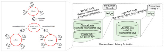 Multi-level blockchains and multi-channel mapping can solve the above information-sharing problem. A node—whether a single device or multiple devices collectively accessing and submitting information—can join a channel. The shared ledger information is confined to that channel. This approach improves privacy by isolating information within the channel and ensures that each node only retains relevant data, enhancing storage efficiency and network communication and ultimately improving the blockchain’s performance. Additionally, in certain cases, terminals may need to access data across different chains. For example, terminals producing B products may need detailed information about the composition of a raw material (the A product), and at this time, cross-chain inquiry may be required. Multi-level blockchain mapping supports cross-chain queries and access control.