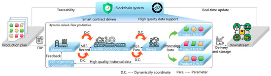 Dynamic mixed flow, as shown in Figure 8, refers to the MES dynamically coordinating the production equipment and links according to the current production requirements to meet the current production needs during the manufacturing process. On the one hand, the blockchain system can provide high-quality data support for the self-organizing of the dynamic mixed-flow production process, making the learning and operation optimization process more reliable, because it is easily recoverable after a single point failure occurs, and its data are not easy to tamper with. On the other hand, blockchains are distributed systems, and their system nodes can act as smart and secure agents by running smart contracts. The use of smart contracts on a blockchain further enhances the reliability of dynamic mixed flow’s execution.