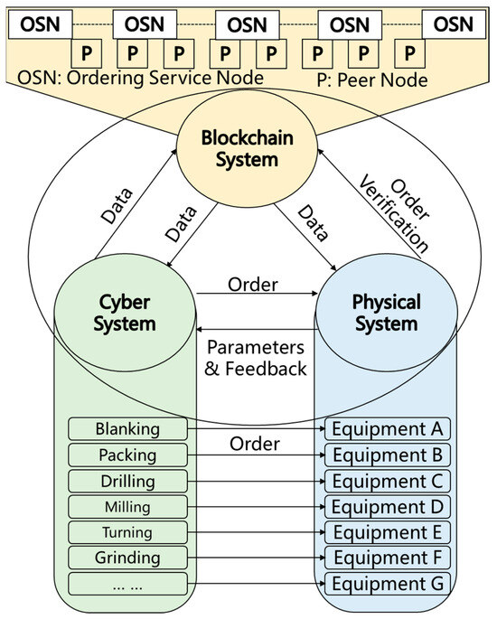 A blockchain security scheme can be designed to architect a PQM system, providing a unified description framework for data’s traceability and process optimization in a manufacturing system by integrating data, networks, and intelligent systems. As shown in Figure 9, based on the CPS framework, the scheme is supposed to incorporate the blockchain as the security guarantee elements of the system, forming a Blockchained Cyber–Physical System (BCPS), in which the CPS undertakes the coordination functions and production tasks, while blockchain ensures system security.