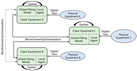 To achieve industrial artificial intelligence for blockchained quality management in a distributed context, a potential solution is the combination of federated learning and the blockchain. Implementing AI within blockchain can accelerate the process of product design, collaboration, and manufacturing [76]. Additionally, combining blockchain with federated learning enhances data privacy and decentralization, showing promise for improving quality management [77]. A typical federated learning workflow for blockchained quality management can be illustrated in Figure 10. The basic process can be designed as follows: each blockchain node includes two parts of federated learning; one part is called a global model for a holistically fitting parameter prediction model, and the other part is called a local agent, which records real-time parameters of equipment and the processes of products. Model modifications from any node will be synchronized with other nodes using the blockchain. At the same time, each node runs a local agent, which learns from local data to update the global model locally and adjust the parameters of the equipment locally. In this way, on the one hand, large-scale learning and repetitive learning are avoided. On the other hand, because the global model is synchronized through blockchain, nearly all relevant data is analyzed, and the learning performance is usually slightly lower than full-scale machine learning. In the learning process of the local agent, a verifiable computation can be introduced to record the intermediate learning process proofs on the blockchain step by step to prevent individual nodes from forging computation results. This step-by-step recording also facilitates subsequent audits of errors. The whole training and prediction process can be implemented via a smart contract. Finally, the global model is incrementally improved based on the latest equipment and product data, providing decision support for the accurate adjustment of subsequent equipment parameters. In addition, the intermediate process of federated learning is securely recorded in the blockchain using a verifiable computational approach to prevent a single terminal from maliciously changing the learning outcome.