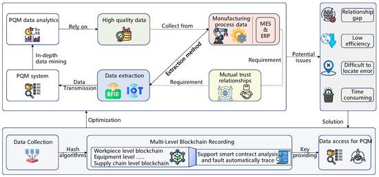 Data analytics are the foundation of PQM in Industry 4.0. By recording extensive online manufacturing process data of parts and equipment, in-depth data mining can be carried out to support PQM and process optimization. Firstly, PQM is a data-dependent system. From the data mining and learning of manufacturing knowledge to the production planning in ERP and to the production process optimization in MESs, and then to the control and management of production quality, all of them are supported based on real, reliable, and high-quality data [36]. Secondly, PQM records contain detailed production processes and require suppliers to provide data as one of the proofs of production quality, which helps build mutual trust relationships more securely among production participants. At the same time, objective and real-time data can more accurately represent PQM and ensure consistency in product quality [78].