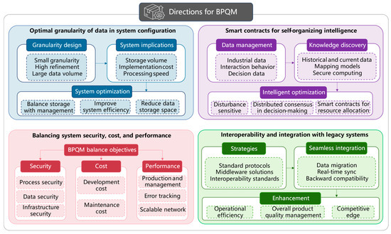 Synchronization of multiple digital twins is an effective enabler to achieve the fusion of physical space and cyberspace. Building on this, Leng et al. [48] proposed a digital twin-based remote semi-physical commissioning (DT-RSPC) method to address challenges in the traditional physical commissioning of manufacturing systems. By using semi-physical simulation, the DT-RSPC method supports the distributed integration of the whole smart manufacturing process. Human et al. [49] proposed a design framework that integrates digital twins with service-oriented approaches, enabling the effective aggregation and utilization of data from complex physical systems. Driven by a new generation of information technology and manufacturing technology, physical systems can be modeled through the integration of various types of data. In the running process of physical objects, relevant knowledge can be accumulated continuously to realize the high fidelity of physical systems and the optimization of physical systems based on models [50]. BPQM should focus on key technical issues, such as the consistency of communication in the blockchain system, real-time communication of heterogeneous systems, synchronization of asynchronous sampling periods of simulation model soft controllers, semantic translation of instructions, and mutual check of multi-channel feedback information, to support the parallel control of the PQM system.
