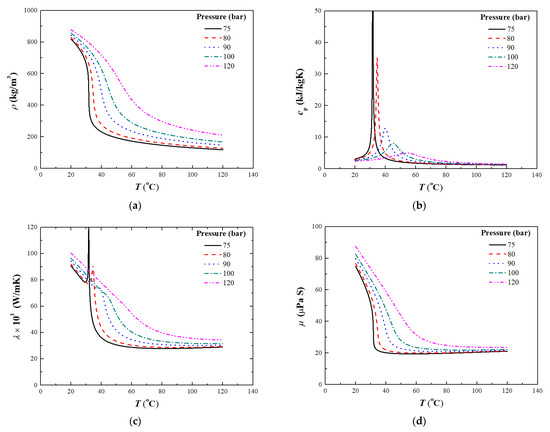 Thermophysical properties of CO2. (a) Density; (b) Specific heat; (c) Thermal conductivity; (d) Dynamic viscosity.