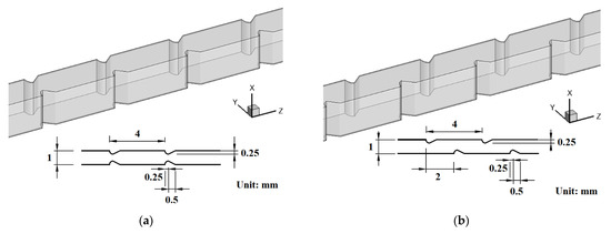 Geometric configuration of the channels with fins in sidewalls. (a) Channel with aligned fins; (b) Channel with offset fins.