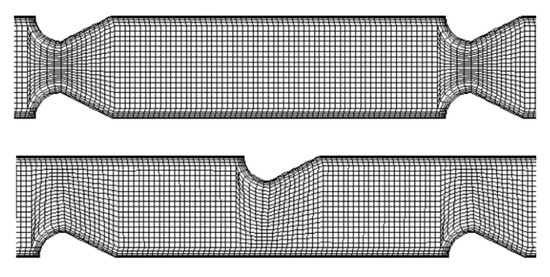 During the simulation, ANSYS Fluent 2019 R1 is employed to solve the governing equations of the model. The SIMPLEC scheme is adopted for solving the coupled differential equations related to velocity, pressure and energy within each control volume. To discretize the convection terms, a second-order upwind method is utilized. The NIST real-gas thermophysical properties of supercritical CO2 are realized by activating and dynamically loading the software REFPROP v9.1 into the solver Fluent. After activation, REFPROP takes over the computation of all relevant thermophysical properties and ensures that property evaluations are handled directly by the database rather than the default Fluent routines. The solutions are converged when the normalized residual values are less than 10−5 for all the variables. For each channel, a grid independence test is performed using several different mesh sizes, as shown in Table 2. The heat transfer coefficient and pressure drop become more stabilized as the grid number increases. For the channel with aligned fins, the difference is less than 1.0% between the grid numbers 1.668 million and 3.335 million for both the heat transfer coefficient and pressure drop. Therefore, the grid number 1.668 million is selected for the simulation of the channel with aligned fins. Correspondingly, the grid number 1.667 million is selected for the channel with offset fins. For accurate calculation of the boundary layer, the mesh near the channel walls is refined as shown in Figure 3.