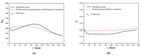 where the exponent n depends on CO2 bulk temperature and channel wall temperature. The and are, respectively, the averaged specific heat and Prandtl number over cross-section at constant pressure. Accordingly, this correlation is adopted for validating the current simulated heat transfer results. For friction factor validation, the well-known Petukhov correlation [26] (as shown in Equation (16)), recognized for its reliability in predicting turbulent flow behavior, is employed.