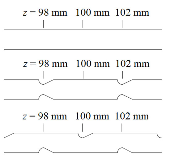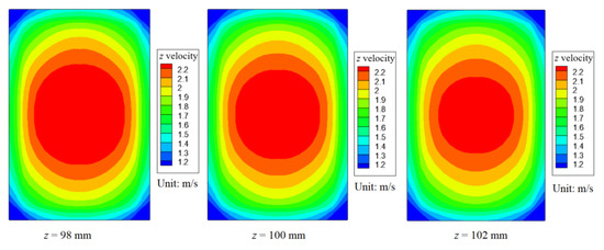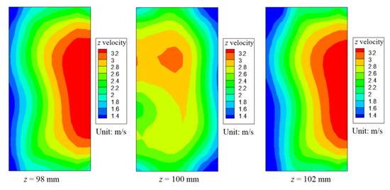 Three cross-sections near the middle of the channel are selected at z = 98 mm, 100 mm and 102 mm, respectively, as indicated in Figure 5, to cover a periodical variation of the flow passage. The local velocity contours for the mass flow rate of 0.001 kg/s are shown by Figure 6, Figure 7 and Figure 8 for the smooth channel, the channel with aligned fins and the channel with offset fins, respectively. In the smooth channel, the flow velocity is highest at the center and significantly lower near the walls, particularly in the corner regions. In addition, as CO2 is cooled, its density increases, which leads to a gradual decrease in flow velocity along the channel. Aligned and offset fin configurations in microchannel sidewalls both aim to improve heat transfer by promoting turbulence, enhancing fluid mixing and disrupting the thermal boundary layer, but they achieve these effects through different mechanisms and to varying extents. In aligned fin configurations, fins are positioned directly opposite each other along the sidewalls, which create a periodically varying but symmetric flow passage. This arrangement forces the supercritical CO2 to accelerate and decelerate in a predictable pattern as it passes through narrow and wide sections. The symmetry leads to strong flow constriction and expansion, and generates high turbulence intensity near the fins. As a result, the aligned fins are more effective in consistently breaking up the boundary layer along the flow path, which leads to greater mixing between the near-wall fluid and the channel core. This often results in higher heat transfer coefficients compared to offset fins. Offset fin configurations, on the other hand, stagger the fin positions along the sidewalls and create an asymmetric and more complex flow path. This design induces frequent changes in flow direction and promotes additional lateral mixing and secondary vortices. While the boundary layer disruption is still significant, it is generally less uniform compared to the aligned configuration, which leads to slightly lower turbulence intensity but potentially reduced pressure drops.