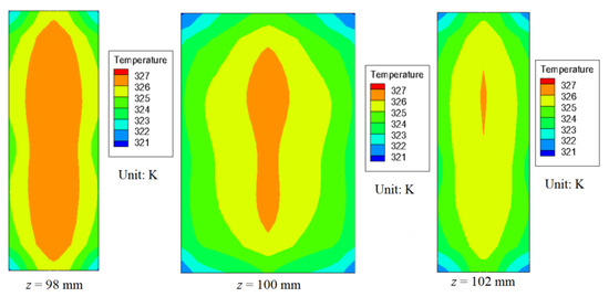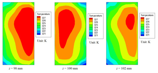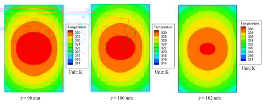 Figure 9, Figure 10 and Figure 11 show the corresponding temperature fields. For the smooth channel, strong temperature stratification is observed. The temperature at the center is significantly higher than near the walls, which indicates limited mixing and weak convective effects. In the channel with aligned fins, the flow passage geometry causes periodic constriction and expansion, which enhances turbulence and disrupts the thermal boundary layer uniformly along the flow path. As a result, the temperature distribution across the channel becomes more uniform, and the temperature gradient in the x-y plane is significantly reduced. The isotherms tend to follow the periodic geometry, and heat is more effectively transferred from the wall to the fluid, which leads to improved thermal performance. In the channel with offset fins, the staggered arrangement causes irregular flow redirection, which enhances lateral fluid motion and creates local recirculation zones. These effects break up thermal stratification more randomly than in the aligned configuration. Although this results in more complex and asymmetrical temperature fields, it also improves fluid mixing and contributes to higher convective heat transfer. However, due to the less regular disruption of the boundary layer, the reduction in the temperature gradient is less uniform than in the aligned case.