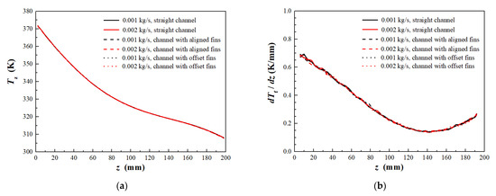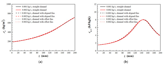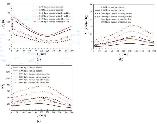 Figure 14 demonstrates the local heat transfer characteristics, including the temperature difference between the bulk fluid and channel walls, the heat transfer coefficient and the Nusselt number. At any given axial position (z), the finned channels exhibit a significantly smaller wall-to-fluid temperature difference compared to the smooth channel. Among the finned designs, the channel with aligned fins shows the lowest temperature difference. In the smooth channel, increasing the mass flow rate leads to a notable rise in temperature difference. In contrast, the finned configurations, particularly the aligned fin design, show only a modest increase in temperature difference with higher flow rates. Heat transfer performance in this context is primarily influenced by how effectively energy is transported from the wall-adjacent fluid to the core flow. The introduction of fins enhances turbulence and fluid mixing and leads to a substantial improvement in convective heat transfer. At a flow rate of 0.001 kg/s and z = 150 mm, the local heat transfer coefficients are 6.7 kW/(m2·K) for the smooth channel, 15.9 kW/(m2·K) for the aligned fin channel and 11.5 kW/(m2·K) for the offset fin channel. Near the pseudo-critical region, heat transfer behavior closely follows changes in specific heat capacity, which peaks around this point. As a result, the local heat transfer coefficient initially rises, reaches a maximum, and then declines downstream. It is important to note that the heat transfer peak aligns more closely with the pseudo-critical temperature near the wall rather than with the bulk temperature. The maximum heat transfer occurs at z = 130 mm, whereas the pseudo-critical bulk temperature appears around z = 145 mm. The Nusselt number, which is a function of both the heat transfer coefficient and thermal conductivity, reflects these trends. The rise in thermal conductivity downstream helps to moderate the decline in Nusselt number when the fluid temperature drops below the pseudo-critical point.