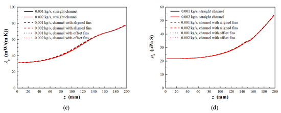 Local fluid thermophysical properties. (a) Density; (b) Specific heat; (c) Thermal conductivity; (d) Dynamic viscosity.