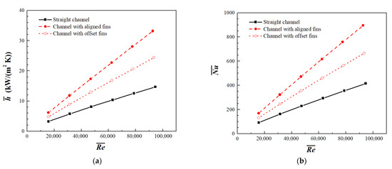 Average heat transfer performance. (a) Heat transfer coefficient; (b) Nusselt number.