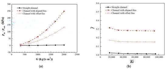 Figure 17a illustrates how the total pressure drop varies with increasing mass flux of supercritical CO2. The total pressure drop is influenced by both the mass flux and the channel geometry, with frictional losses typically being the primary contributors. As mass flux rises, the pressure drop generally increases significantly. Thermal conditions such as heating or cooling also affect the pressure drop through flow acceleration or deceleration. In smooth channels, flow deceleration during cooling can notably reduce the pressure drop, which mitigates the total pressure drop. For instance, when the mass flux increases from 333 kg/(m2·s) to 2000 kg/(m2·s), the pressure drop in the smooth channel rises only from 0.4 kPa to 4.7 kPa. In contrast, channels with fins experience much larger pressure drops due to enhanced turbulence and added form drag. For aligned fins, the pressure drops climb sharply from 7.5 kPa to 248.9 kPa, potentially increasing compressor power and affecting system efficiency. The offset fin configuration produces lower pressure drops, increasing from 4.1 kPa to 133.3 kPa. Figure 17b shows the relationship between average friction factor and Reynolds number. Integrated fins significantly elevate the friction factor, particularly in aligned configurations. While the smooth channel’s friction factor decreases from 0.026 to 0.014 as the mass flux rises, the aligned and offset fin channels show minor reductions, from 0.31 to 0.28 and 0.17 to 0.15, respectively. This indicates that the Reynolds number has a limited effect on the friction factor in finned channels. It should be pointed out that if the CO2 pressure drop in the gas cooler is a few percentage points of the high-side pressure, its influence on the coefficient of performance (COP) of trans-critical CO2 refrigeration and heat pump systems is generally limited. For example, a 100 kPa gas cooler pressure drop at 100 bar of high-side pressure in typical trans-critical CO2 systems results in a 1% relative pressure drop, which involves a negligible change in system COP (often less than 0.5%).