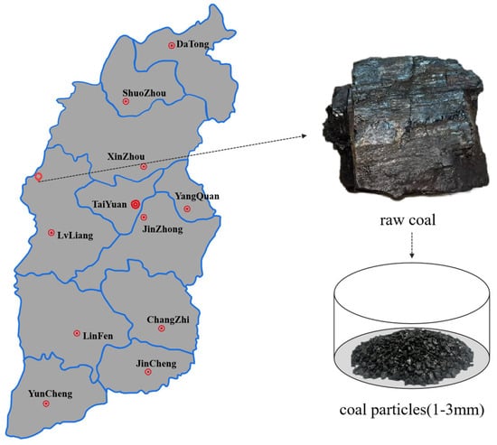 Coal samples were collected from the 13# coal seam at Xiaojiawa Coal Mine (located in Lvliang City, China). The average thickness of the seam is 12.02 m, which is a relatively stable and mineable coal seam across the entire area. The roof was dominated by sandy mudstone, followed by mudstone, and the bottom was dominated by mudstone, followed by sandy mudstone. The coal samples are gas coals with a low degree of metamorphism. The gas content of the No. 13 coal seam ranges from 1.65 to 2.65 m3/t. Despite the relatively low gas content per tonne of coal, the high-intensity mining operations have resulted in significant gas emissions. Simultaneously, due to the low porosity (only 4.82%), conventional drainage methods cannot effectively reduce the gas content. The location of coal samples is shown in Figure 1. Fresh coal samples were wrapped in plastic, sealed, and transported to the laboratory, where they were crushed and sieved to obtain coal particles with a diameter of 1–3 mm, dried, and used for experiments. The basic parameters of the coal samples are tabulated in Table 1.