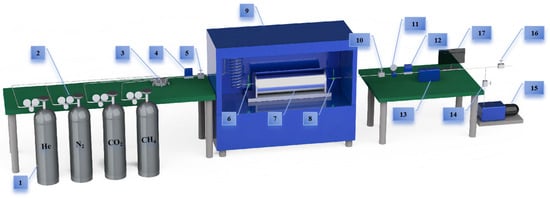 A bidirectional diffusion apparatus was designed to study the diffusion behavior of CH4 under variable-flow gas injection conditions, as illustrated in Figure 2. The apparatus includes a gas injection system, a gas injection flow control and monitoring system, a thermostat box, a coal sample tank, a back-pressure valve, a gas concentration sensor, a vacuum pump, and data acquisition computer, and a gas injection steel pipe. The gas injection system consists of high-pressure cylinders (He, CH4, N2, and CO2), a six-way valve, and a relief valve to control the pressure and composition of the injected gas. The flow control and monitoring system consists of two flow-meters, installed at both the inlet and outlet ends of the coal sample tank. The inlet flow-meter controlled the gas injection flow rate, while the outlet flow-meter monitored the flow rate of the gas leaving the tank. The thermostat box was used to maintain a constant temperature in which equipment such as inlet and outlet flow-meters, coal sample tank, back-pressure valve, gas pressure sensor, stop valve, etc., was placed. The internal volume of the coal sample tank was approximately 800 mL. Quartz chips were positioned at both ends of the canister to facilitate uniform dispersion of the injected gas. The data acquisition system collected experimental data on parameters including temperature, inlet and outlet gas pressure, gas flow rate, gas concentration, and other variables. Additionally, the back-pressure valve regulated the gas pressure within the tank. Following the completion of each experimental set, the apparatus was evacuated using a vacuum pump.