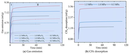 Changes of CH4 emission and desorption during constant flow N2 injection under different pressure conditions.