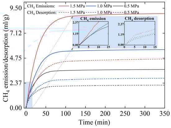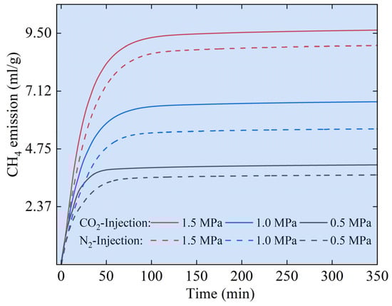 Using constant flow N2 injection for CH4 replacement as an example, Figure 5 demonstrates the trend of CH4 emission and desorption with time under different adsorption equilibrium pressure conditions. At adsorption equilibrium pressures of 0.5 MPa, 1.0 MPa, and 1.5 MPa, the cumulative CH4 emissions were 3.56 mL/g, 5.61 mL/g, and 9.06 mL/g, respectively, and the cumulative CH4 desorption was 2.20 mL/g, 2.87 mL/g, and 4.98 mL/g, respectively. It is evident that higher adsorption equilibrium pressures lead to increased CH4 emissions and desorption over the same time period. In comparison to unidirectional CH4 diffusion, bidirectional diffusion processes resulted in a respective increase of 45.96%, 18.53%, and 21.71% in CH4 emissions at each pre-adsorption gas pressure level. Similarly, CH4 desorption exhibited increases of 163.69%, 188.82%, and 161.12% in the same order. The injection of N2 not only enhances the removal of free CH4 but also effectively promotes the desorption of CH4 in the adsorbed state.