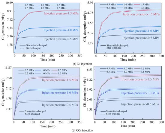 Figure 8 illustrates the effect of various injection gases and injection modes on the bidirectional diffusion of CH4 under identical conditions at each adsorption equilibrium pressure. Figure 9 and Figure 10 present comparisons of CH4 emissions and desorption across three gas injection types: sinusoidal-changed, step-changed, and constant flow. It is evident that CH4 emissions and desorption exhibit an initial rapid increase over time, followed by a gradual attainment of equilibrium. This behavior aligns with the pattern observed during constant-flow gas injection to facilitate CH4 diffusion. However, cumulative CH4 emissions and desorption levels vary under different injection conditions.