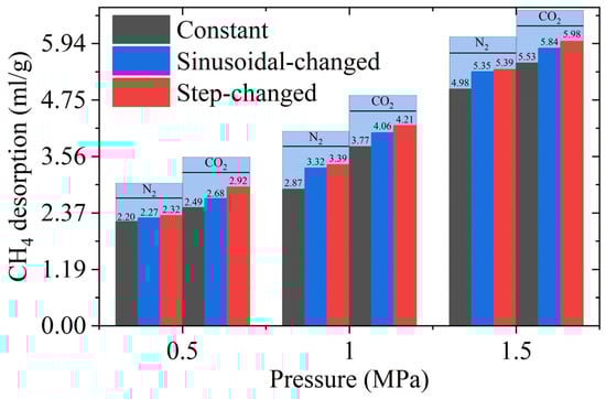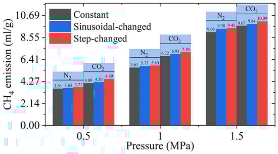 In the context of the three injection methods, when CO2 is used as the injected gas, both CH4 emission and desorption are greater compared to when N2 is employed. Furthermore, this difference becomes more pronounced as the pressure level increases. This phenomenon primarily arises from coal’s superior adsorption affinity for CO2 over N2. Free CH4 was flushed out during N2 injection, and the desorbed CH4 was mainly contributed by the reduction of CH4 partial pressure after N2 injection, and only a small portion of the desorbed CH4 was due to the competitive adsorption between N2 and CH4. However, after injecting CO2, the dual effects of lowering CH4 partial pressure and competitive adsorption between CO2 and CH4 enabled more CH4 to be desorbed from the coal body compared with N2 injection. Furthermore, at the same gas adsorption equilibrium pressure level for both N2 and CO2 injection, the extent of CH4 emission and desorption followed this sequence: step-changed > sinusoidal-changed > constant flow, with the variable-flow gas injection method further enhancing CH4 emission from coal. When CO2 was employed as the injected gas, CH4 emissions and desorption under the conditions of step-changed flow injection were significantly higher than those of other injection methods at each pressure level. In contrast, when N2 served as the injected gas, the disparities in CH4 emissions and desorption between sinusoidal-changed and step-changed injection were minimal at pressure levels of 0.5 MPa and 1.0 MPa. However, at a pressure level of 1.5 MPa, CH4 emissions and desorption were notably higher in the step-changed injection method as opposed to the sinusoidal-changed injection method.
