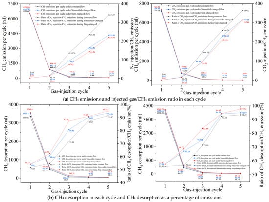 The emissions of CH4 can be divided into two components: the original free CH4 flushed out and the adsorbed CH4 desorbed. As illustrated in Figure 11, irrespective of whether N2 or CO2 is injected, and across the three injection modes, the CH4 emissions during the five injection cycles follow this order: step-changed > sinusoidal-changed > constant flow. Similarly, the CH4 desorption was ranked as follows: step-changed > sinusoidal-changed > constant flow. CH4 emissions can be categorized into three stages. In Stage I, during the first cycle, CH4 emissions significantly exceed those in subsequent cycles. Early in the cycle, a substantial portion of free-state CH4 is flushed out, while in the later part, CH4 adsorbed within the coal matrix pores desorbs, leading to an increasing desorption percentage. In Stage 2, in the second cycle, the decline in CH4 emissions slows down, further reducing initial free-state CH4, with a rapid increase in CH4 desorption at this point. Stage 3 encompasses the third, fourth, and fifth cycles, where the decrease in CH4 emissions levels off. By the fifth cycle, the ratio of CH4 desorption to CH4 emissions reaches approximately 90%. As indicated by Figure 11a, the ratio of N2/CO2 injection to CH4 emission in each cycle exhibits significant divergence after the second cycle. The consumption order of injected gas for each volume of CH4 emitted is as follows: constant flow > sinusoidal-changed > step-changed. This suggests that the variable-flow injection method offers a higher utilization rate of the injected gas and a more effective replacement effect. Notably, under each gas injection method, except for the first cycle, the quantity of injected CO2 surpasses that of injected N2 for the same volume of discharged CH4. This phenomenon results from gradual coal particle adsorption of CO2 over time, leading to an increase in the consumed CO2 volume.