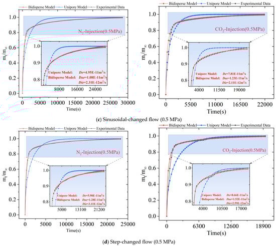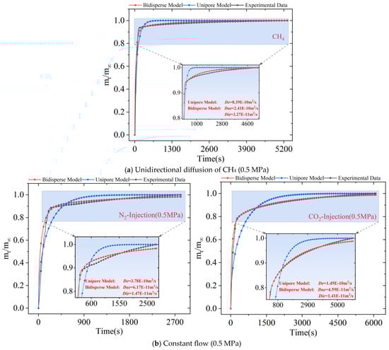 The applicability of unipore and bidisperse models for both unidirectional and bidirectional gas diffusion is separately analyzed. At each pre-adsorption pressure level, these two diffusion models exhibit a high degree of similarity in their respective simulation outcomes, whether for unidirectional or bidirectional diffusion. Therefore, this section presents a comparison between the simulated and experimental diffusion model curves at a pressure level of 0.5 MPa, as depicted in Figure 12. It is evident that, concerning the experimentally measured mt/m∞ curves, the simulated curves of the bidisperse model closely align with the measured curves, outperforming the unipore model. This superiority arises from the fact that, in contrast to the simplified pore structure assumption in the unipore model, the bidisperse model accounts for both macropores and micropores, offering a more accurate representation of the complex pore structure in the coal samples. Additionally, its corresponding diffusion coefficients for macropore and micropore pores provide a more comprehensive explanation of gas diffusion processes within the coal. Furthermore, the bidisperse model demonstrates a significantly enhanced simulation performance for CH4 and CO2 compared to N2 in both unidirectional and bidirectional diffusion scenarios. This is due to the utilization of the bidisperse model, which considers gas adsorption within the coal body, enabling a more precise simulation of the transport behavior of easily adsorbed gases, such as CO2 and CH4, in the coal seam.