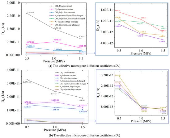 Variation of CH4 effective macropore diffusion coefficient (Dae) and effective micropore diffusion coefficient (Die) with gas pressure for each gas injection method.