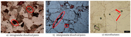 The microscopic characteristics of the intragranular dissolution pores, intergranular dissolved pores, and microfractures in the Xu-2 Formation.