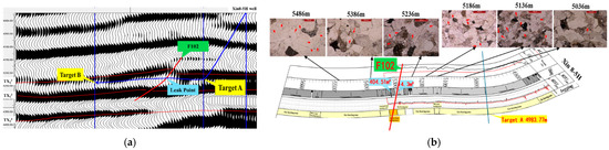 Distribution of fault and fractures in well Xin 8-5H. (a) Fault distribution in well Xin 8-5H; (b) fracture distribution in well Xin 8-5H. The green box represents the location of faults, the yellow box represents the positions of target points A and B in the horizontal section, the blue box represents the location of leakage points during the drilling process, and the red arrow represents microfractures.