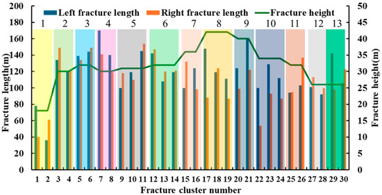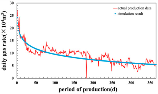 Model verification was conducted using Well J from tight gas Block W as a case study. This horizontal well features a 1360 m lateral section with 16 fracturing stages, each containing 3–4 clusters spaced at 20–25 m intervals. Micro-seismic monitoring data revealed created fracture networks extending 160–430 m laterally and 10-50 m vertically (Figure 16). Log interpretation confirmed the absence of fault intersections along the horizontal trajectory, with the analysis showing minimal natural fracture development in the target formation. Additional reservoir and completion parameters are provided in Table 5. We constructed a full-wellbore fracturing productivity model for Well J and validated its accuracy against actual production data. As demonstrated in Figure 17, the simulated daily production profile shows excellent agreement with field measurements, with only a 5.2% deviation between the modeled and observed values. This close match confirms the reliability and predictive capability of our modeling approach for tight gas reservoirs.