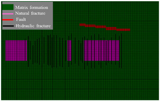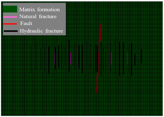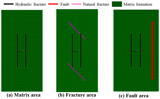 These geological variations necessitated customized fracturing designs for each well. We implemented a differentiated stimulation approach, categorizing fracturing stages into three distinct types (matrix area, micro-fracture area, and fault area) and further classified them into five levels of stimulation intensity for targeted reservoir stimulation (Figure 20). The previous analysis revealed differences in gas production sources between wells Xin 8-5H and Xinsheng 204-1H. To systematically evaluate the productivity-influencing factors across various fracturing stages and inform development strategies for matrix-type reservoirs, we constructed specialized single-stage productivity models. These models, illustrated in Figure 21, were developed according to the unique geological characteristics of the matrix zones, fracture zones, and fault zones, with the corresponding parameters detailed in Table 6. Building upon our earlier model validation work, we omitted redundant verification procedures for this specific analysis phase.