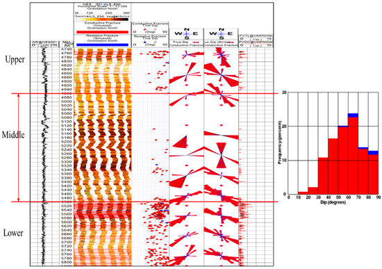Electrical imaging logging explaining the distribution characteristics of natural fractures. In the histogram on the right, red represents conductive fracture dip angle and blue represents resistive fracture dip angle.