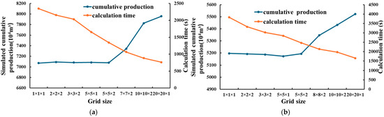 The selection of grid dimensions critically influences both the numerical stability of the simulation results and the computational performance. Therefore, we designed a sensitivity analysis on the grid size (as shown in Table 4) and generated the relationship between grid size, annual cumulative production accuracy, and computational time requirements (Figure 15). The results demonstrated an inherent trade-off: while finer grid resolutions (below 5 m × 5 m × 2 m) enhanced solution stability, they imposed disproportionately greater computational costs. Conversely, coarser grids improved the processing speed but compromised the reliability of the results. After comprehensive evaluation, we identified 5 m × 5 m × 2 m as the optimal grid configuration, achieving an effective balance between numerical precision (with stable production forecasts) and computational efficiency. These grid dimensions were consequently implemented as the standard for all subsequent simulations in our study.