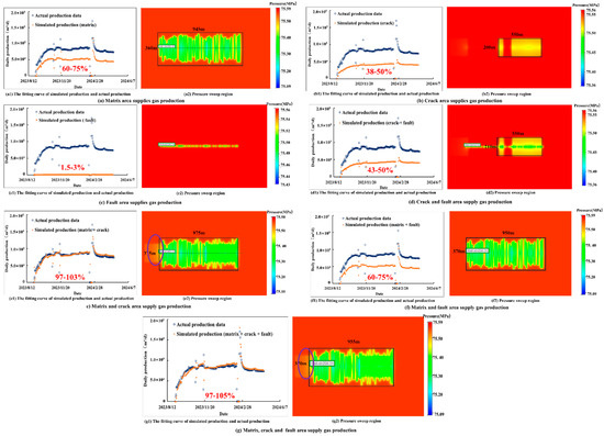 The simulation results demonstrated distinct production contributions for the different gas sources. When only considering the matrix pore contribution (Figure 19a), the model achieved a production matching rate of 60–75%, indicating reasonable agreement with actual production. The pressure distribution revealed interconnected flow between certain fracture networks. Simulation of the fracture zone contribution alone (Figure 19b) showed active production only from the lower fracture zone within the perforated interval, resulting in a 38–50% matching rate, with the upper fracture zone near target A remaining inactive. The fault contribution simulations (Figure 19c) yielded negligible production due to the fault’s 200 m offset from target B and a lack of direct wellbore intersection. The combined fracture–fault simulation (Figure 19d) produced results similar to the fracture-only scenarios, confirming the fault’s minimal contribution under the current conditions.