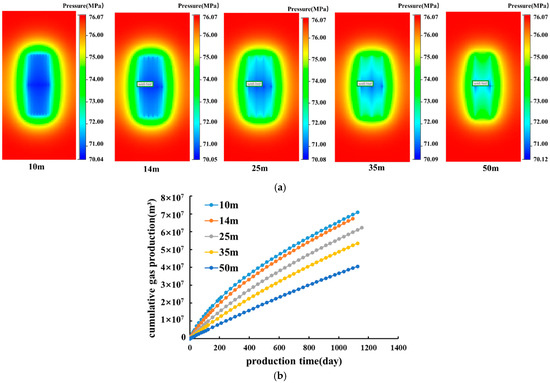 Fracture propagation range and cumulative gas production under different cluster spacings in the fracture area. (a) Pressure interference range under different cluster spacings; (b) cumulative gas well production under different cluster spacings.