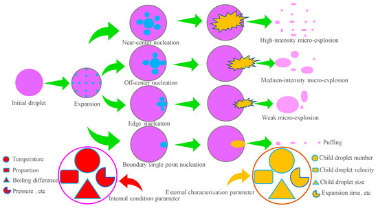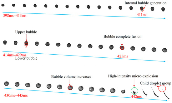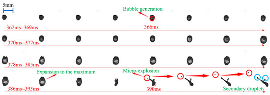 Droplets of mixed fuel with different boiling points will break up rapidly during heating, which is called microexplosion, as shown in Figure 1 [20]. After microexplosion, droplets can form a large number of secondary droplets with different velocities and directions. The movement direction of secondary droplets is related to the surface rupture point of droplets, and the velocity is directly proportional to the vapor pressure inside droplets. By measuring the velocity and acceleration of the droplet, we can study the characteristics of steam pressure and the law of rupture in the droplet. The temperature and the proportion of mixed fuel is a prerequisite for the occurrence of a microexplosion [21,22,23], homogeneous nucleation is the mechanism of the microexplosion of fuels [24,25], and microexplosion intensity is the most interesting research direction for researchers [26,27,28,29,30]. Qiu et al. [30] calculated the microexplosion intensity of biodiesel–ethanol–aluminum powder particle droplets. When the content of aluminum powder is 20%, the microexplosion intensity is maximum. Liu et al. [29] proposed the full life cycle microexplosion intensity of the mixed droplets and analyzed the effect of different intensities of microexplosion on the atomization of fuel.
