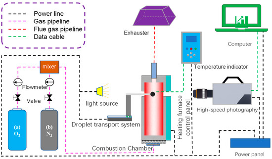 The experimental platform was improved on the basis of previous studies [39,40,41] by adding a flue gas discharge device, while the focal point position was adjusted in order to further reduce the error. The experimental principle is shown in Figure 2: the experimental platform is mainly composed of a heating system, an exhaust system, a guide rail system and a data acquisition system. The heating system is mainly composed of a vertical combustion furnace, which comes from Yixing Zhongyang Machinery Manufacturing Co., Ltd. in Yixing, China, with an upper limit of 1200 °C, which mainly provides an ambient temperature for the droplets. The exhaust system is mainly composed of an exhaust fan, which mainly excludes the waste gas in the combustion chamber. The guide rail system consists of guide rails and stepping motors to transport the droplets. The data acquisition system consists of a high-speed camera and analysis software to track the droplets and analyze the data.