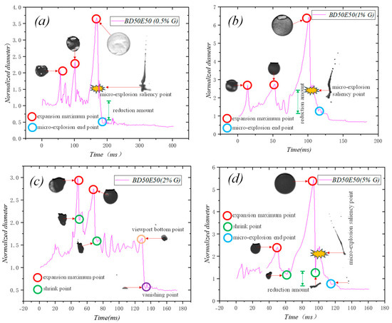 Evaporation and microexplosion curves of BD50E50 droplets with different graphene mass concentrations ((a): 0.5%, (b): 1%, (c): 2%, and (d): 5%)) at 800 °C.