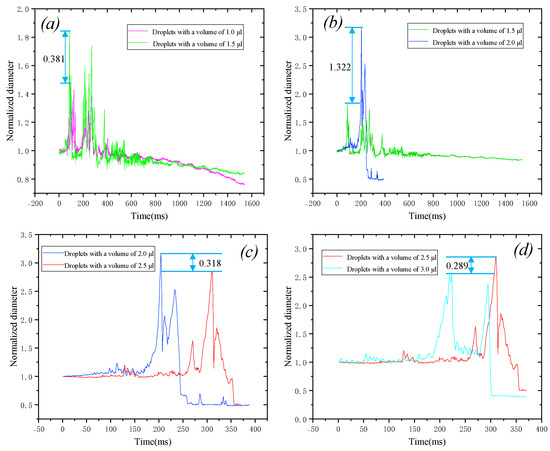 Evaporation and microexplosion curves of BD50E50 droplets of different volumes ((a): 1.0 μL and 1.5 μL, (b): 1.5 μL and 2.0 μL, (c): 2.0 μL and 2.5 μL, and (d): 2.5 μL and 3.0 μL)) at 600 °C.