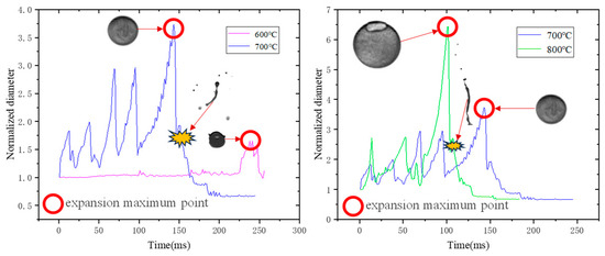 Temperature was an important condition to promote the homogeneous nucleation of the same components in mixed droplets during heating. The higher the temperature, the faster the rate of homogeneous nucleation. The evaporation and microexplosion curves of the BD50E50 (1%G) droplets under 600 °C, 700 °C and 800 °C were obtained by pairwise comparison, as shown in Figure 8. With the increase in temperature, the normalized diameter of the BD50E50 (1%G) droplet gradually increased, and the droplet reached the maximum value of 6.43 at 800 °C. The BD50E50 (1%G) droplet appeared to expand at 600 °C, but there was no microexplosion phenomenon. This was mainly due to the slow formation rate of ethanol vapor inside the droplet, and the bubbles inside the droplet moved to the edge of the droplet under the action of uneven internal pressure during the expansion process; finally, the internal vapor was released at the edge of the droplet. The BD50E50 (G1%) droplets under 700 °C and 800 °C produced a more significant expansion. The normalized diameter of the droplets was 3.657 at 700 °C and 6.43 at 800 °C. It can be seen from Figure 8 that transparency of the droplet was more uniform at 800 °C, indicating that the liquid layer of the droplet was more uniform, the pressure in the bubble was greater and the microexplosion was stronger during the expansion process. The BD50E50 (G1%) droplet produced a strong microexplosion after expansion, and the droplet was torn by the internal vapor pressure into a number of several sub-droplets of varying volume. In a certain range, the higher the temperature (the experimental temperatures in this study were 600 °C, 700 °C and 800 °C), the faster the vaporization rate of low-boiling components inside the droplet, and the more nucleation sites inside the droplet, resulting in a more balanced internal force of a large number of droplets and a slower bubble movement rate. This not only provided important conditions for the expansion of the droplet but also significantly improved the pressure inside the droplet, thus forming a microexplosion with higher intensity.