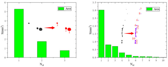 Mixed droplets can produce different numbers and volumes of sub-droplets during microexplosion or ejection. The greater the microexplosion intensity of droplets, the more sub-droplets, the more completely destroyed droplets and the faster the evaporation rate of droplets. The number and area of sub-droplets when the BD50E50 (1%G) droplets generated a weak microexplosion and strong microexplosion at 600 °C and 800 °C, respectively, are shown in Figure 9. The BD50E50 (1%G) droplets at 600 °C produced a weak microexplosion, forming three sub-droplets with the maximum area of 5.28 mm2. The BD50E50 (1%G) droplets at 800 °C produced a strong microexplosion, forming 10 sub-droplets, with the largest secondary droplet area of 3.02 mm2. The higher the ambient temperature, the faster the vaporization speed of low-boiling components inside the droplet, the higher the internal pressure of the droplet, the higher the intensity of the microexplosion generated by the droplet and the more sub-droplets generated by the microexplosion [20,26,27]. The mixed droplets produced a large number of sub-droplets with different volumes in the process of microexplosion, resulting in a significant increase in the evaporation area of the droplets, further promoting the evaporation and combustion of droplets and significantly improving the combustion efficiency of fuel.