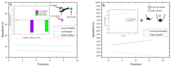 The sub-droplet dynamic characteristics of a BD50E50 (G1%) droplet (a) with a volume of 2.0 μL and a BD60E40 (G1%) droplet (b) with a volume of 1.5 μL at 600 °C.