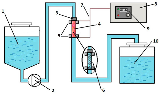 Schematic diagram of an installation for generating plasma in water under cavitation conditions: 1—inlet water tank; 2—pump; 3—hydrodynamic emitter; 4—plasma reactor; 5—electrodes; 6—cavitation field in the reactor in the absence of high-frequency electrical pulses; 7—high-voltage cable; 8—generator; 9—control panel; 10—outlet tank with treated water.